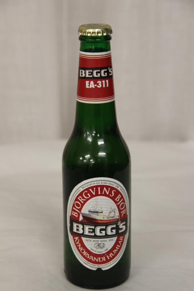 Græn glerflaska með gylltum tappa með Víking-merkinu. Sérmerktur bjór: Begg's - EA-311 - Alkóhól 5,6 %. Stærð: 330 ml.