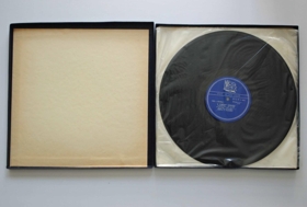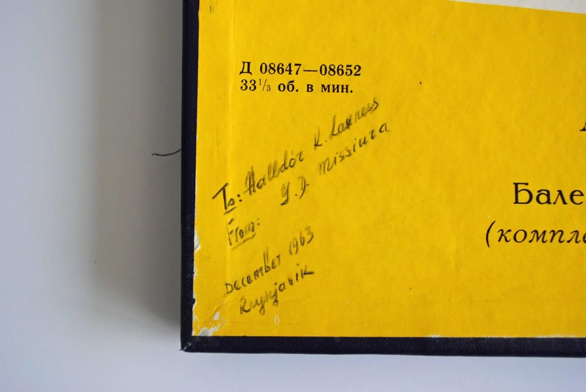Framan á kassan utan um plöturnar er skrifa: "To: Halldór Laxness From: Y.D. Missiuza December 1963 Reykjavik"