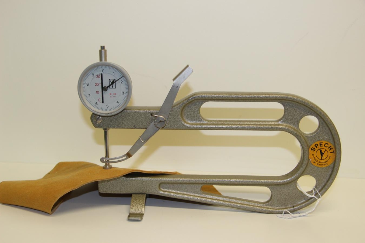 Mælirinn er skífulaga og var notaður til að mæla þykkt á skinnum þegar verið var að þynna þau. Lítið skinnsýnishorn fylgir með.