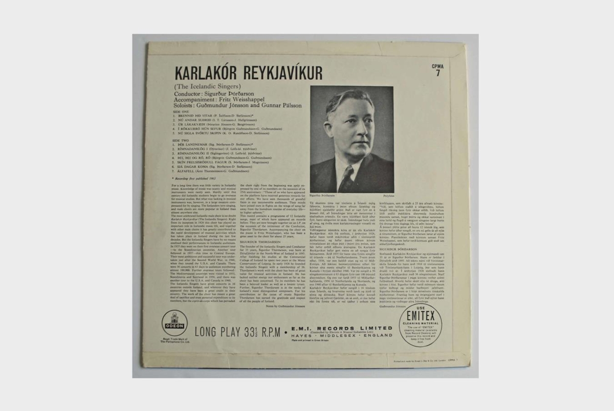 Karlakór Reykjavíkur undir stjórn Sigurðar Þórðarsonar flytur íslenska söngva. Píanóleikari er Fritz Weisshappel og einsöngvarar þeir Guðmundur Jónsson og Gunnar Pálsson. Platan er greinilega ætluð erlendum markaði þar sem allar upplýsingar eru bæði á íslensku og ensku.