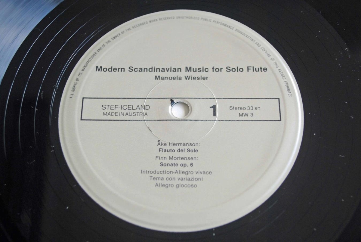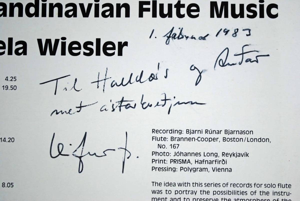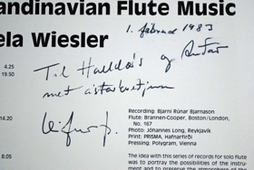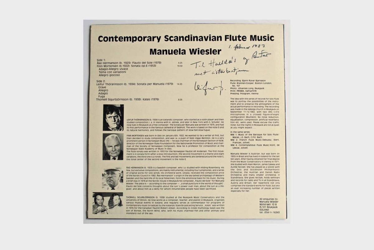 Manuela Wiesler flautuleikari flytur verk eftir Leif Þórarinsson, Finn Mortensen, Åke Hermanson og Þorkel Sigurbjörnsson. Aftan á umslagið er ritað með penna: "1. febrúar 1983 Til Halldórs og Auðar með ástarkveðjum Leifur Þ."
