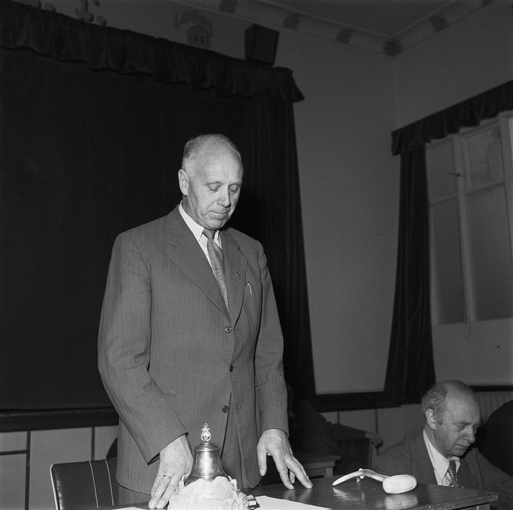 Maður stendur við borð og heldur ræðu. Fundarhamar og fundarbjalla á borði. Þorsteinn Sigurðsson bóndi á Vatnsleysu. Búnaðarfélag Íslands fundar.
