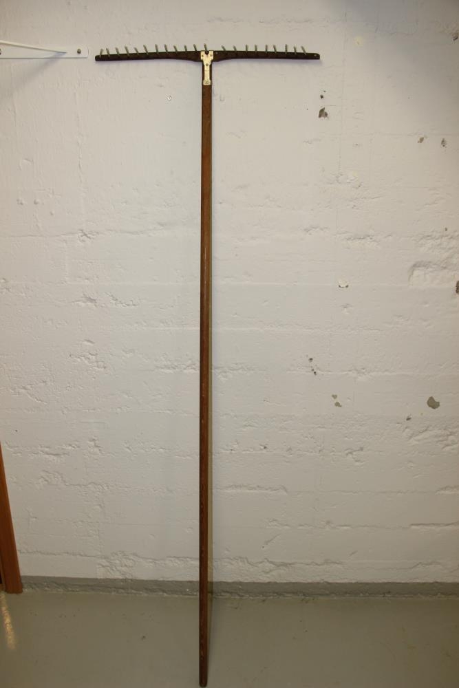 Hrífan er með áltindum og álklemma festir hausinn á skaftið. Stafirnir H.M. eru grafnir í skaftið. Hrífan var í eigu Hólmfríðar Magnúsdóttur. Hún var gjöf frá Lárusi Björnssyni, föðurbróður hennar, sem rak Amboðaverksmiðjuna Iðju með og fyrir Sveinbjörn Jónsson, kenndan við Ofnasmiðjuna.