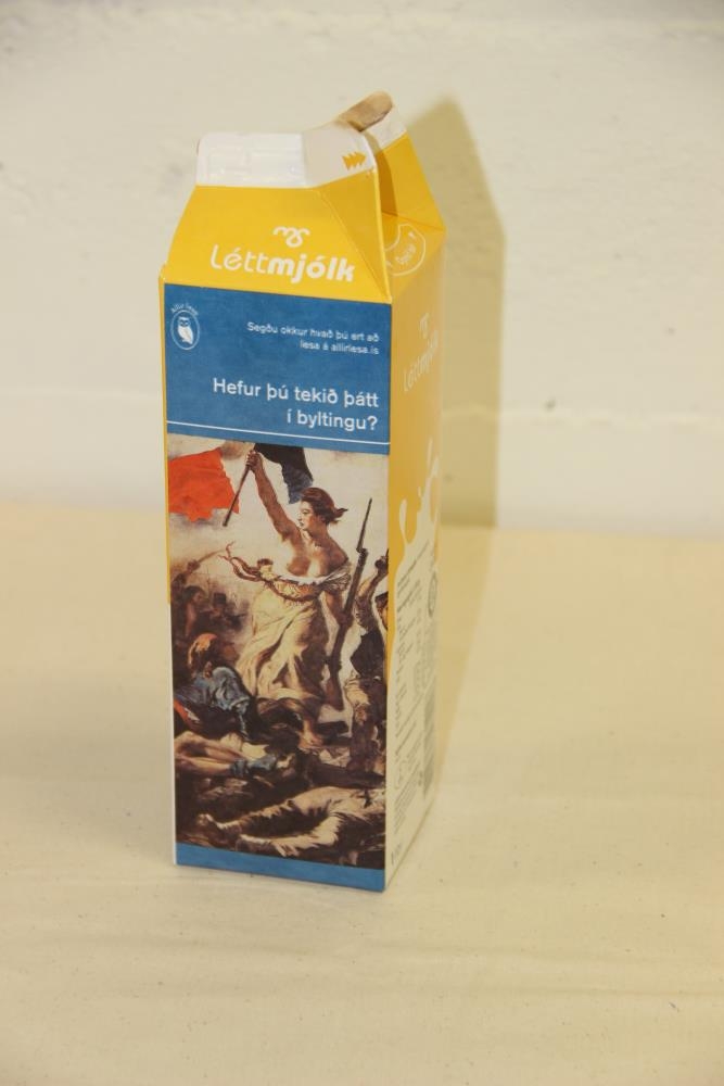 Fernan er gul, hvít og blá. Á henni er mynd og texti: „Hefur þú tekið þátt í byltingu?“ Segðu okkur hvað þú ert að lesa á allirlesa.is. Fernan tekur 1 lítra.