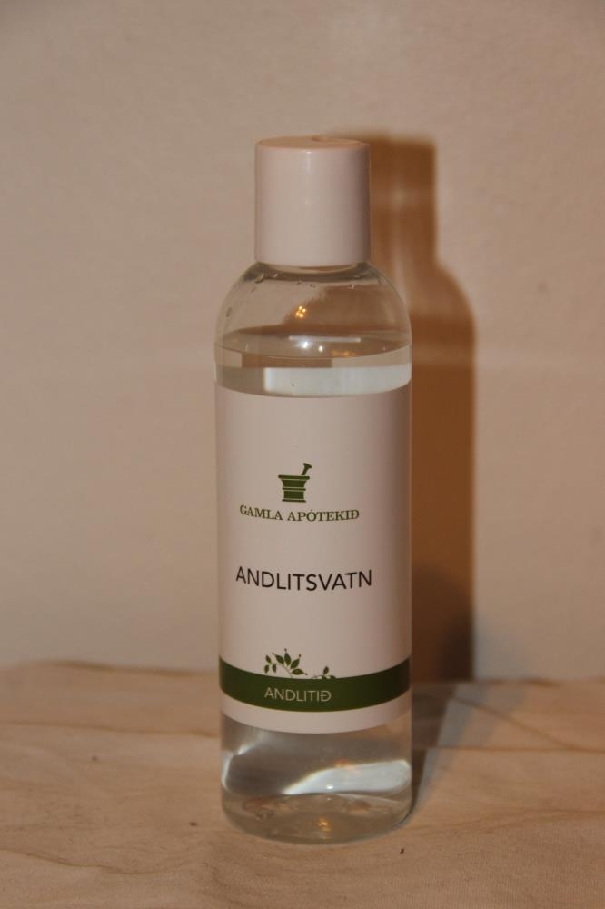 Glært plastglas með hvítum tappa og grænu prenti. Texti: Gamla apótekið - Andlitsvatn - Andlitið - Milt andlitsvatn sem veitir raka og verndar húðina. Gefur létta og fríklega tilfinningu. Hentar öllum húðgerðum. Stærð: 200 ml.