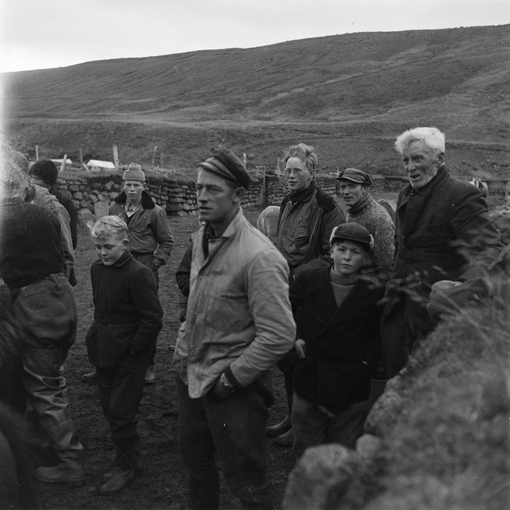 Stafnsrétt. Svartárdalur. Karlar og drengir bíða fjárhóps í rétt. Þekkja má Marka-Leifa eða Hjörleif Sigfússon í hópnum. Sjá Tíminn 23. september 1954.