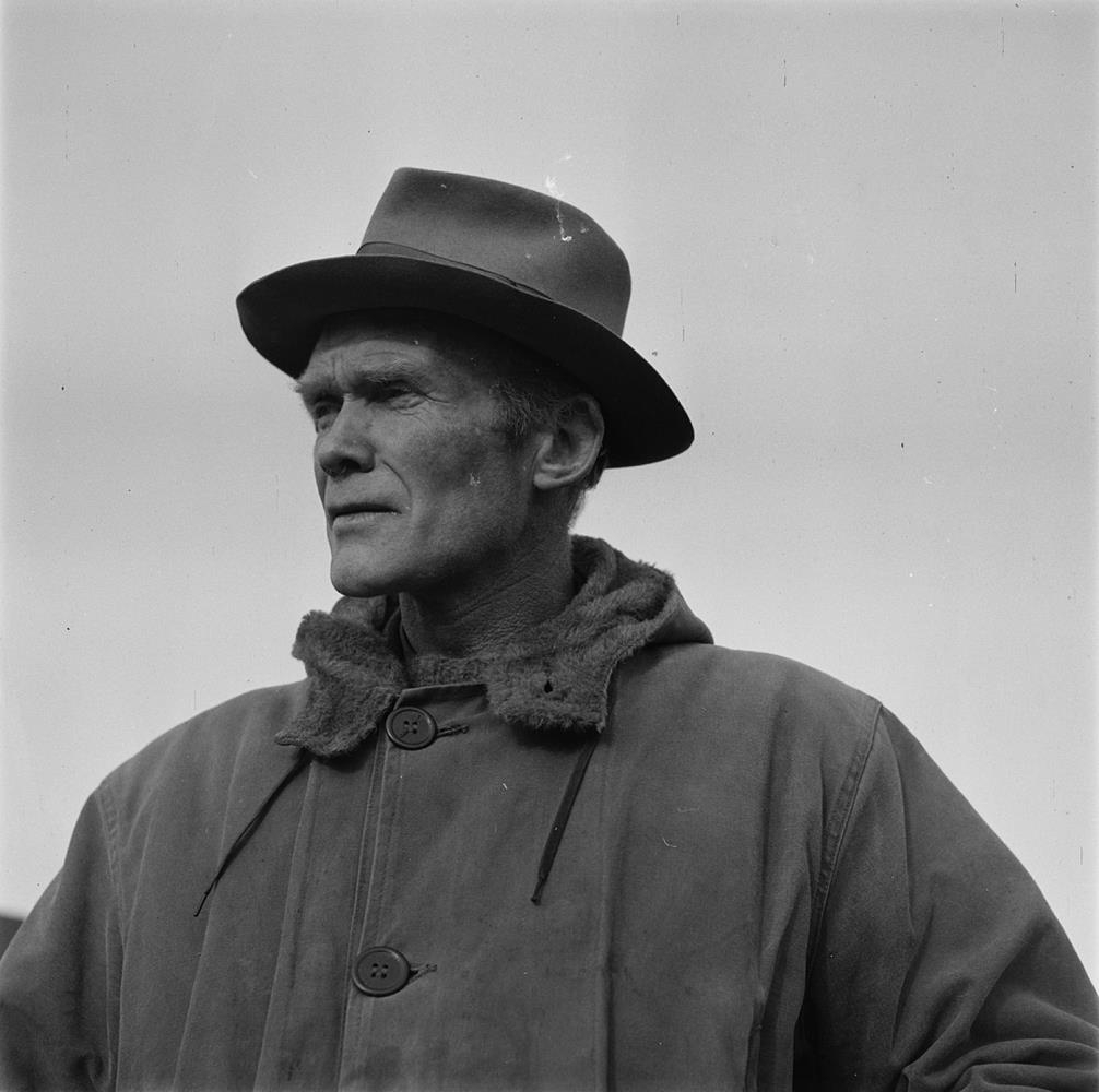 Stafnsrétt. Svartárdalur. Brjóstmynd af manni í Íslandsúlpu með hatt. Guðmundur Guðmundsson bóndi í Fossum í Svartárdal og gangnaforingi. Sjá Tíminn 23. september 1954.