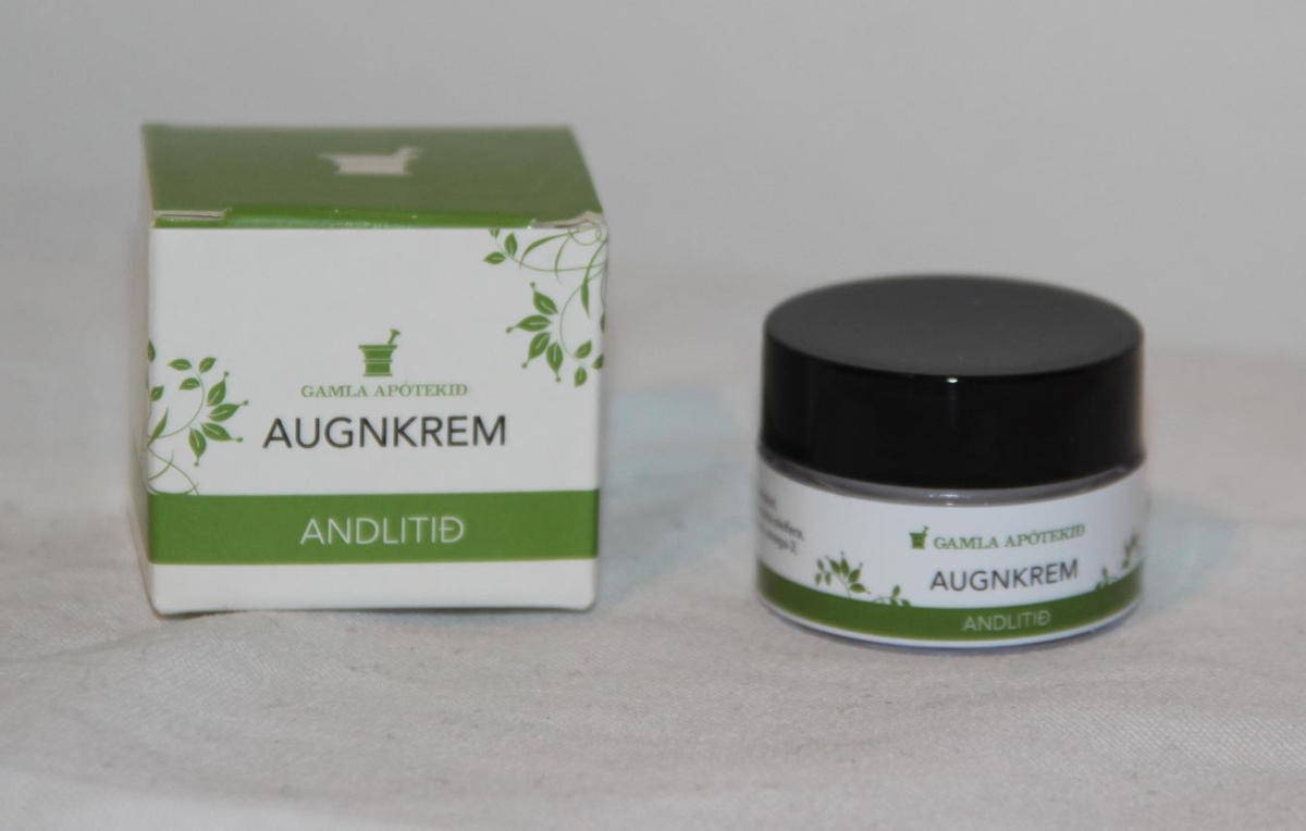 Lítil glær glerkrukka með svörtu plastloki og í pappaöskju. Texti: Gamla apótekið - Augnkrem - Andlitið - Viðheldur raka og nærir viðkvæma húð í kringum augu, gefur ljóma og frískleika. Bera skal þunnt lag á augnsvæði. Hentar öllum húðgerðum. Stærð: 10 ml.