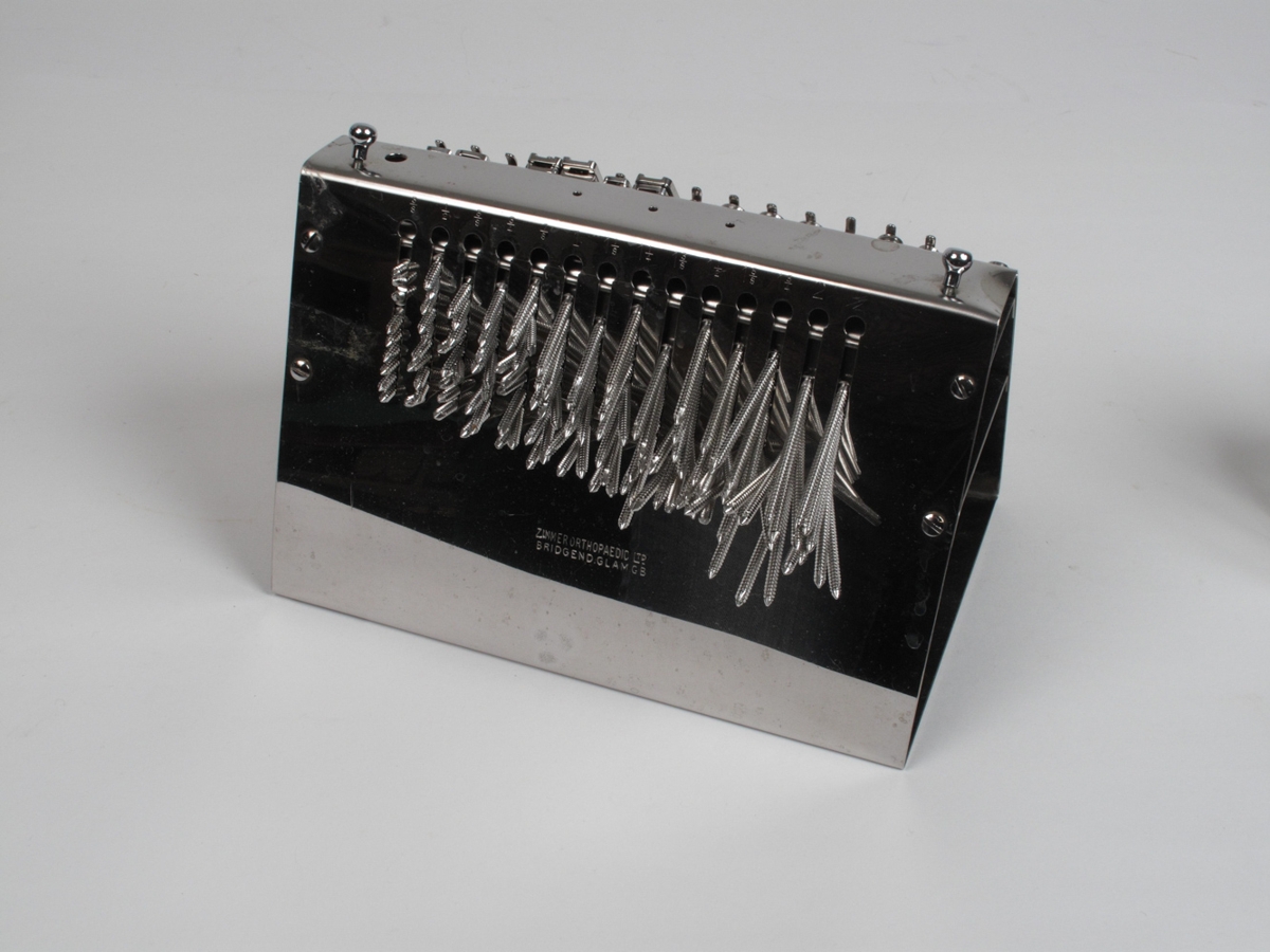 Halldór Baldursson læknir færði safninu þetta statív. Það er af skurðstofu Landsspítalans. Langhliðar statívsins eru heilar stálplötur. á annarri eru hankar þar sem hengdar eru á beinaplötur og á hinni eru raufar fyrir skrúfur. Var notað við aðgerðir á beinum. Með statívinu fylgdi ljósrit úr vörulista frá framleiðanda þess. Þar segir um statívið: BONE PLATE AND SEW CONTAINER OUTFITS. Manufactured from Stainless Steel. Full range of plates and screws can be sterilized at one time and are available to the surgeon when operative field is open. Twist drill can be easily selected..