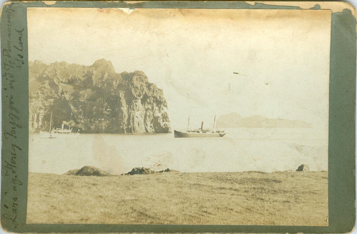 Tvö skip, strandferðaskipið Laura (væntanlega það stærra) og kong Trygve, við innsiglinguna í Vestmannaeyjum. Vinstra megin við myndina stendur „Lára“ og „kong Tryggvi“ við Vestmannaeyjar.