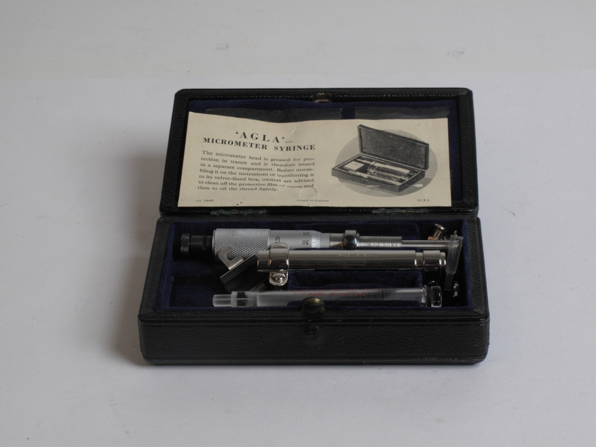 Þorsteinn Þorsteinsson efnafræðingur á Tilraunastöð H.Í. í meinafræði að Keldum, sem afhenti muninn skrifar um hann: Micrometer syringe frá Burroghs Wellcome London. Þetta tæki var til að mæla lítið magn af vökva mjög nákvæmlega, frá fáum mikrólítrum upp í nokkur hundruð. Tæki af þessu tagi urðu úrelt uppúr 1970 þegar á markaðinn kom miklu hraðvirkari tæki. Ekki er með vissu hagt að tiltaka hvenær það kom að Keldum. Það er líklega fyrir 1970, gæti verið milli 1950 og 1960 og líklegast er að Halldór Grímsson hafi notað það. Tækið er enn í lagi utan að nálarnar sem fylgja því hæfa ekki dælunni..