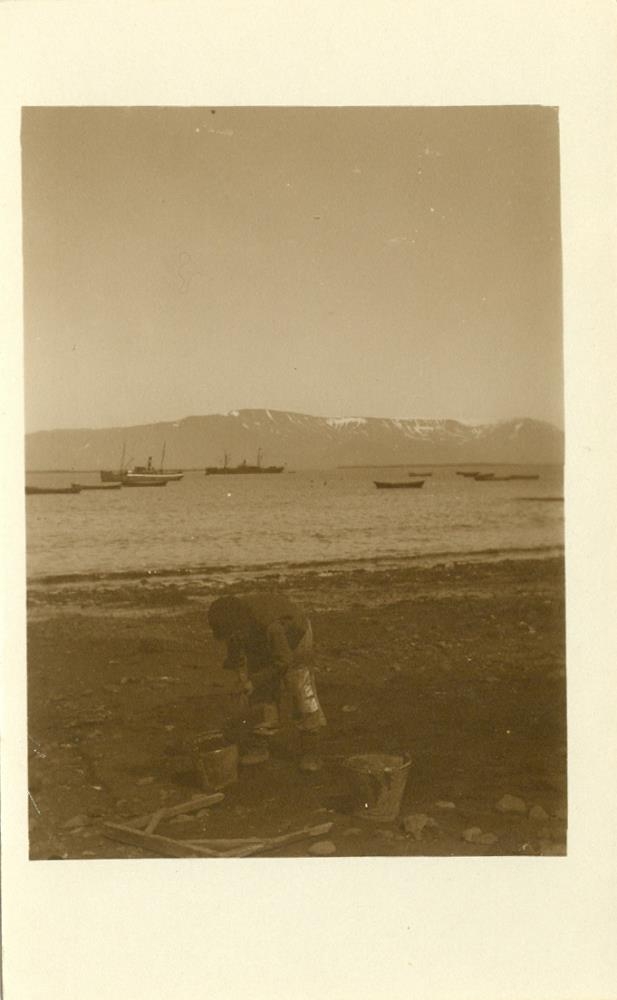 Maður að moka sandi í fjöru með skóflu upp í fötu, önnur fata stendur þar hjá ásamt trégrind til burðar. maðurinn er í bættum buxum. Sér til skipa og báta úti á sjó.
