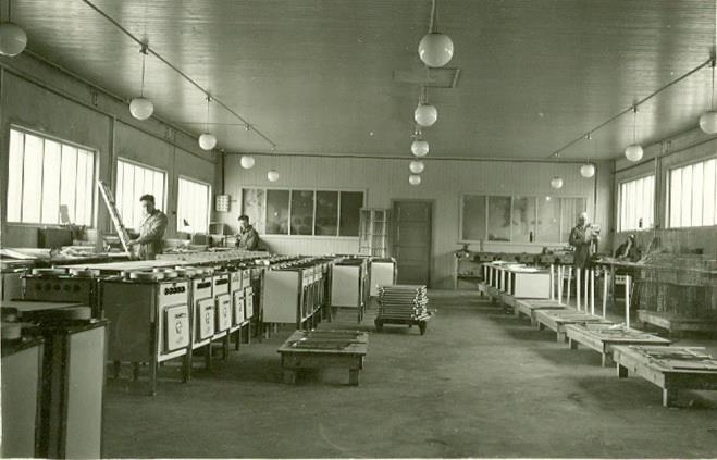Menn að störfum í vinnslusal við samsetningu og frágang á eldavélum. Páll Helgason sonur Jóns biskups til vinstri framar.