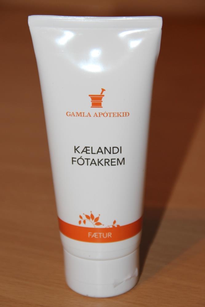 Hvít plasttúpa með hvítu smelltu plastloki. Texti: Gamla apótekið - Kælandi fótakrem - Fætur - Kælandi krem sem hefur frískandi áhrif á fætur. Sérstaklega gott fyrir þreytta fætur og fótapirring. Forðist að kremið berist í augu eða slímhúð Stærð: 100 ml.