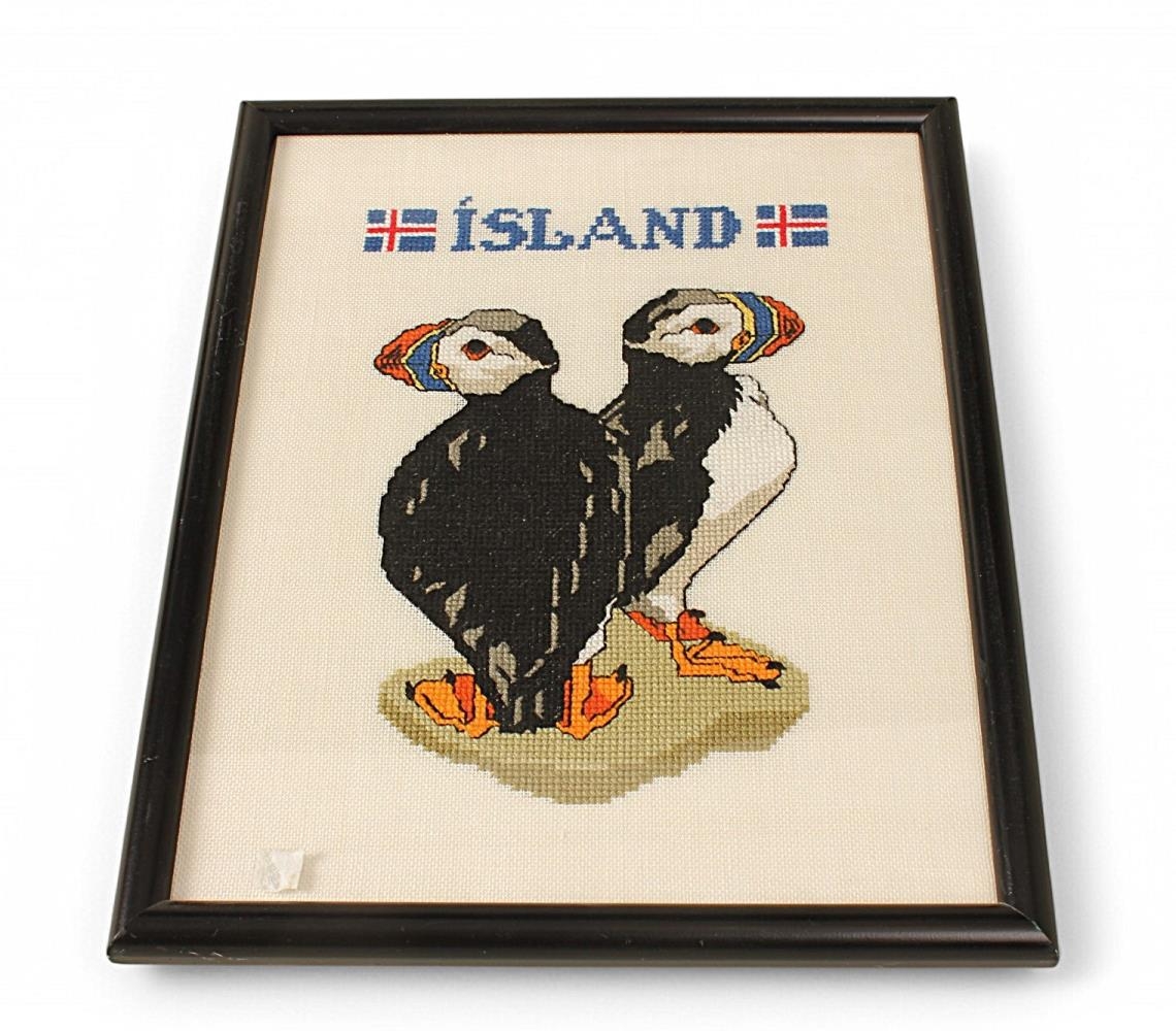 Útsaumsmynd, krosssaumur. Lundar tveir, fyrir ofan er áletrun: ÍSLAND og fánar sitt hvoru megin við áletrunina.