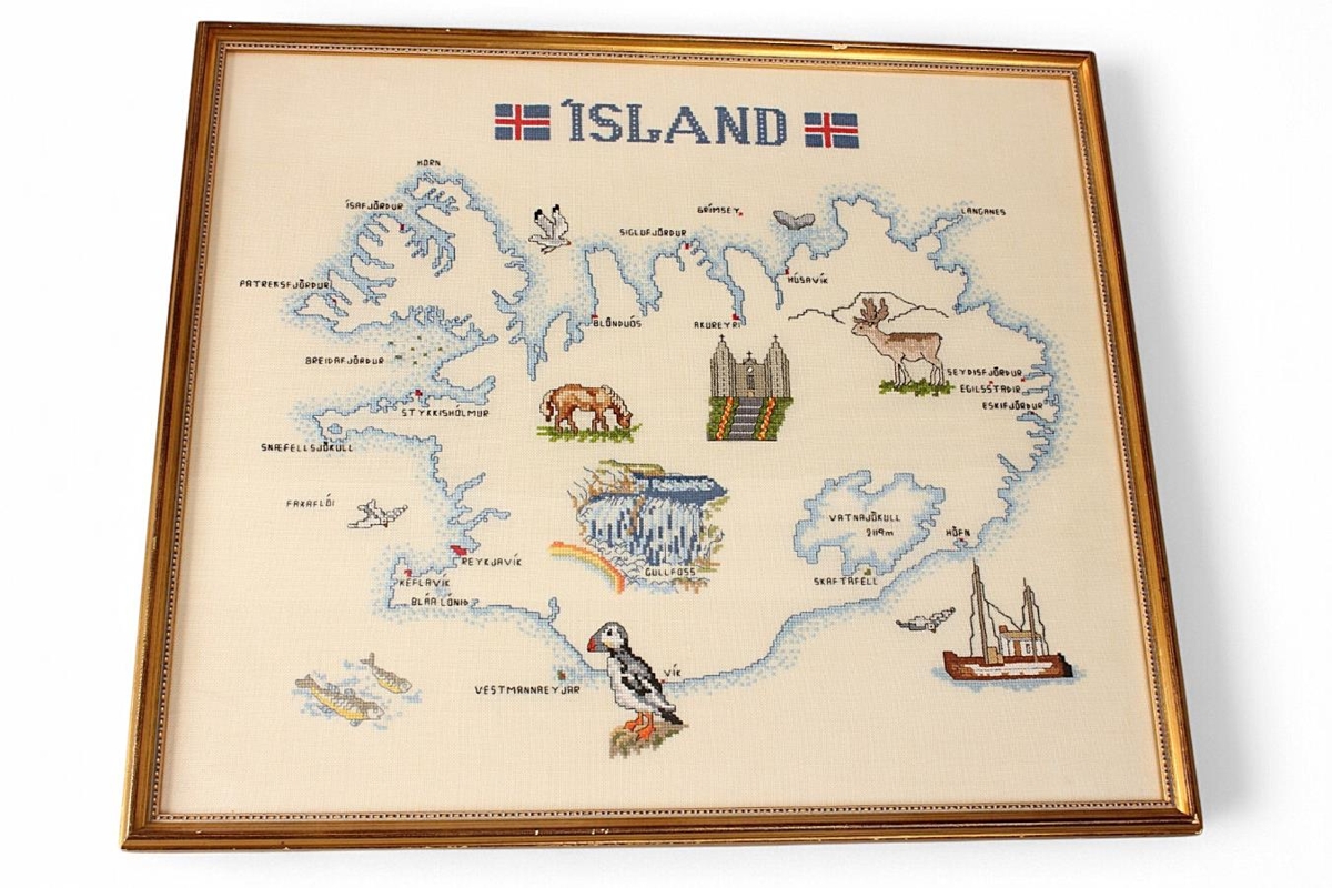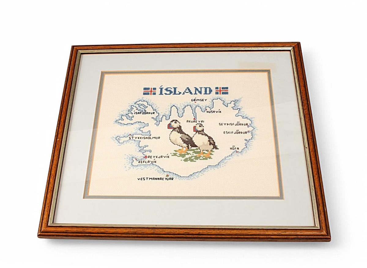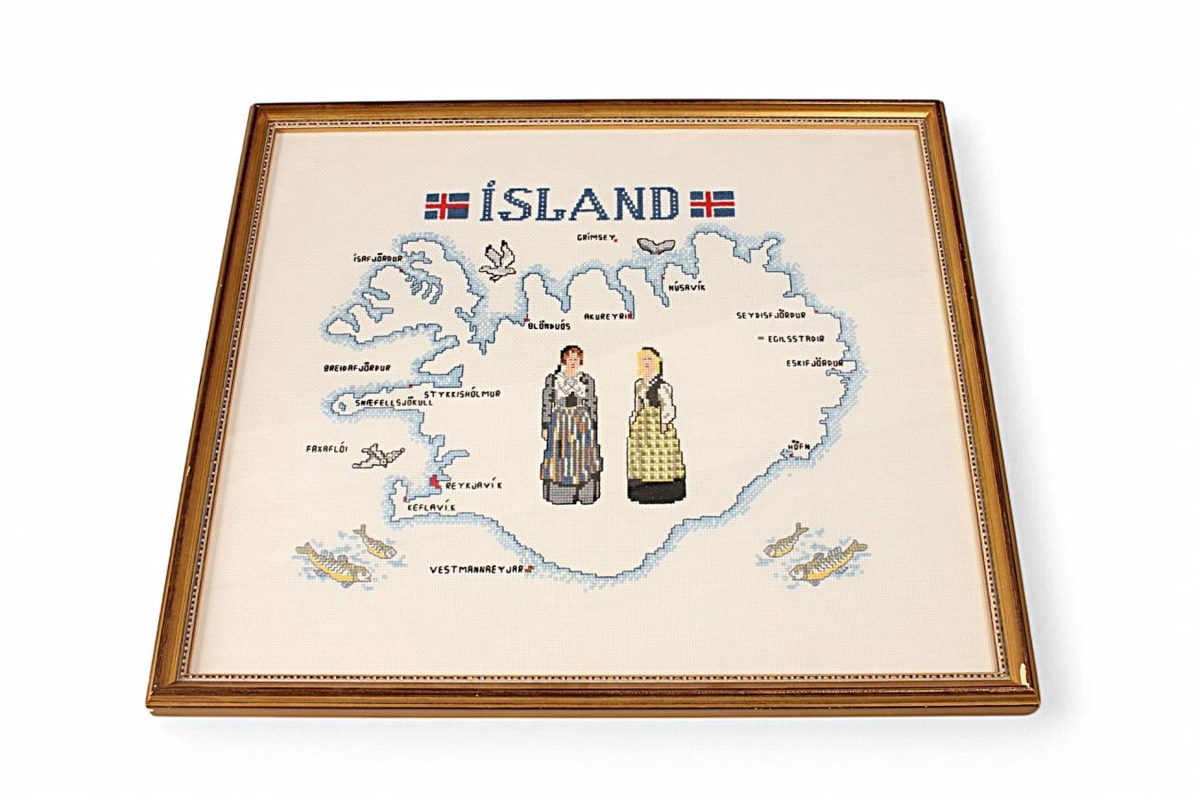 Útsaumsmynd, Ísland. Hvítur grunnur,útlínur landsins ásamt táknmyndum.