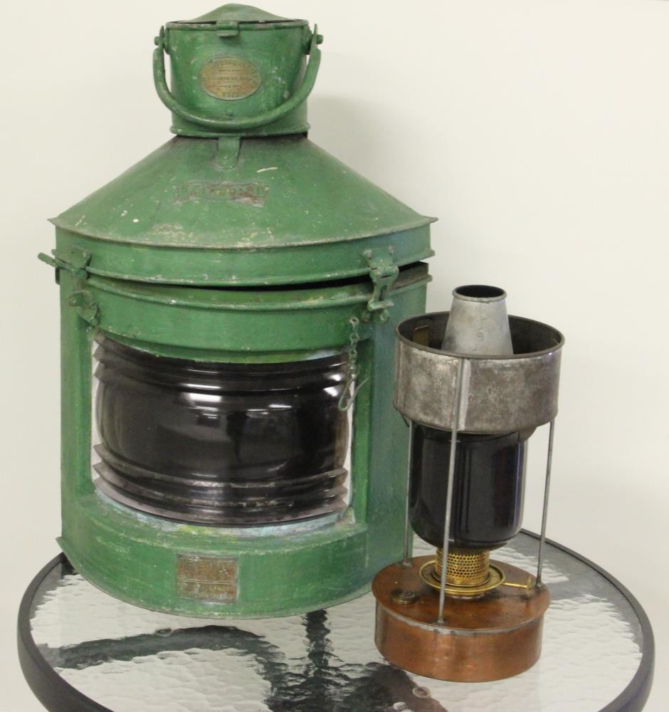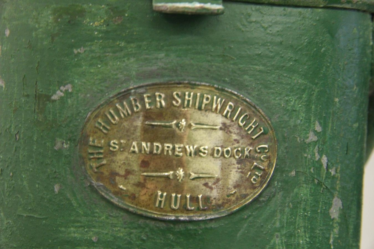 Skipsluktin er græn með olíulampa inn í luktinni. Á henni eru tvær plötur með áletrun: Meteorik 51659 Patent no. 546575 og The Humber Shipwright co Ltd. - S. Andrews dock - Hull. Stærð lampans er: 17x17x34 cm.