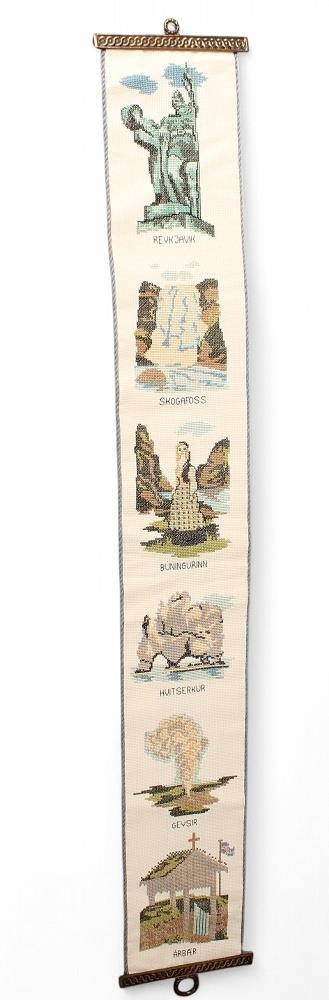 Útsaumaður klukkustrengur, krosssaumur. Sex myndir: Stytta af Ingólfi Arnarsyni í Reykjavik, Skógarfoss, stúlka í þjóðbúning, Hvítserkur, Geysir, klukknaportið í Árbæ.