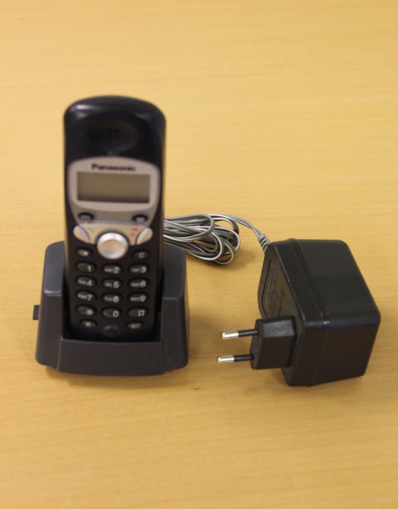 Svartur þráðlaus borðsími. Hann er svartur og móðustöðin er einnig svört. Model nr.PQL V3000BY AS.