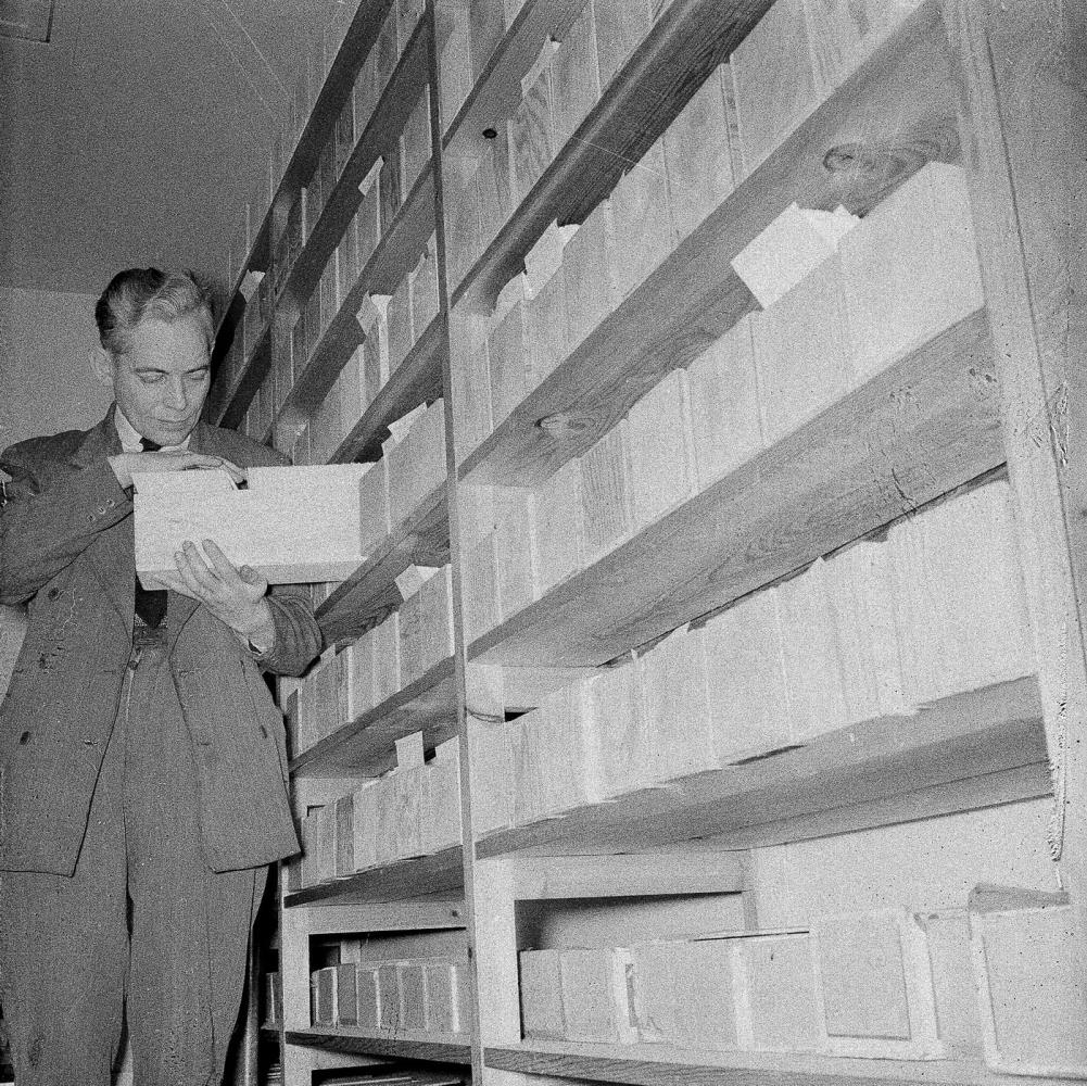Orðabók Háskólans. Maður að skoða seðla í seðlakassa. Ásgeir Blöndal Magnússon forstöðumaður Orðabókarinnar.