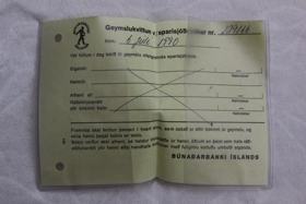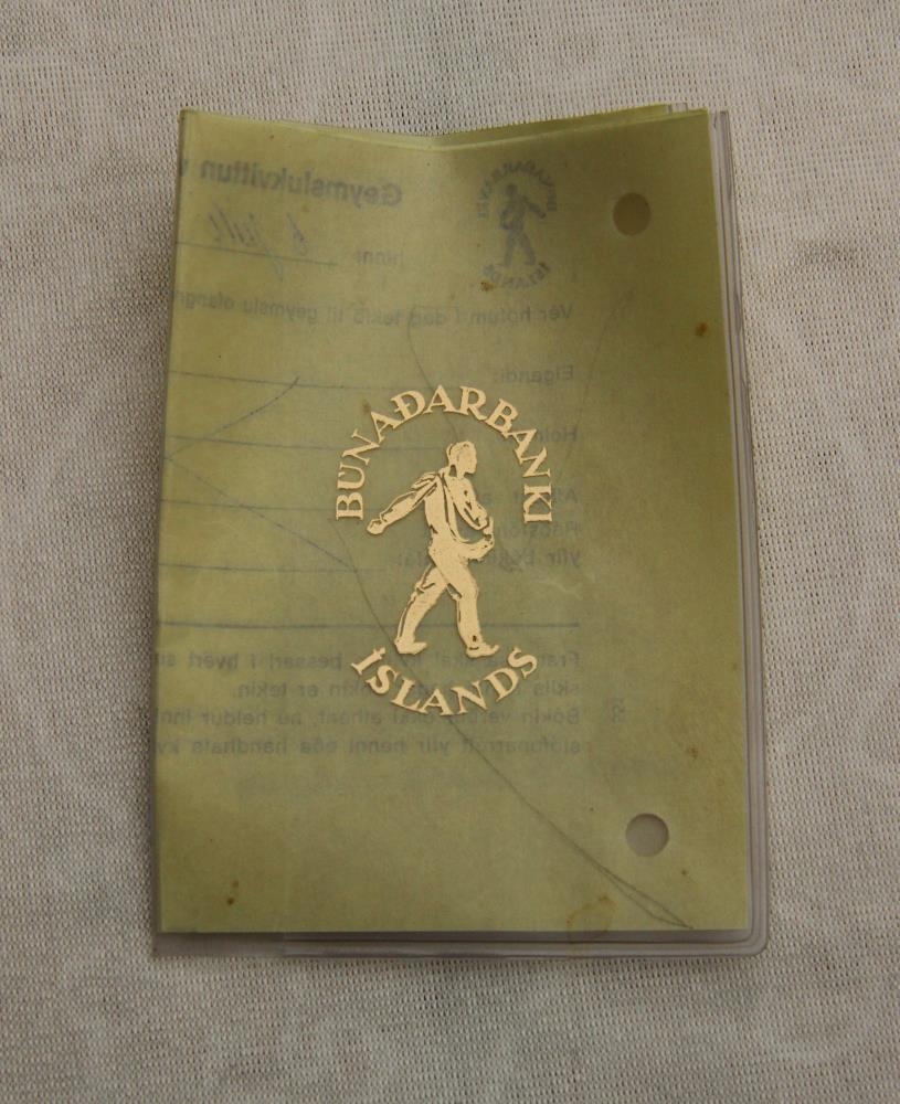 Plastvasinn/kvittanabókin er úr glæru plast með gylltu merki: Búnaðarbanki Íslands. - Í bókinni/vasanum er geymslukvittun vegna sparisjóðasbókar.