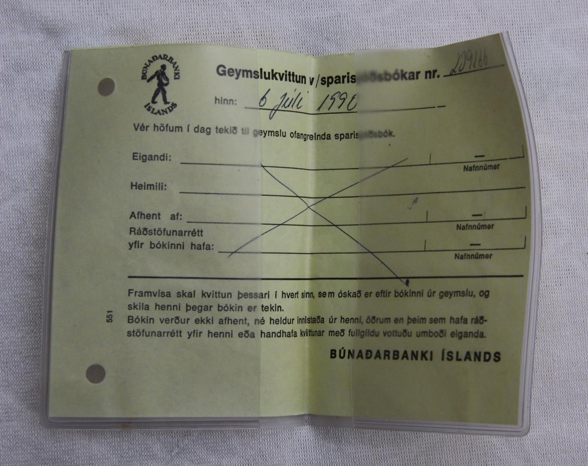 Plastvasinn/kvittanabókin er úr glæru plast með gylltu merki: Búnaðarbanki Íslands. - Í bókinni/vasanum er geymslukvittun vegna sparisjóðasbókar.