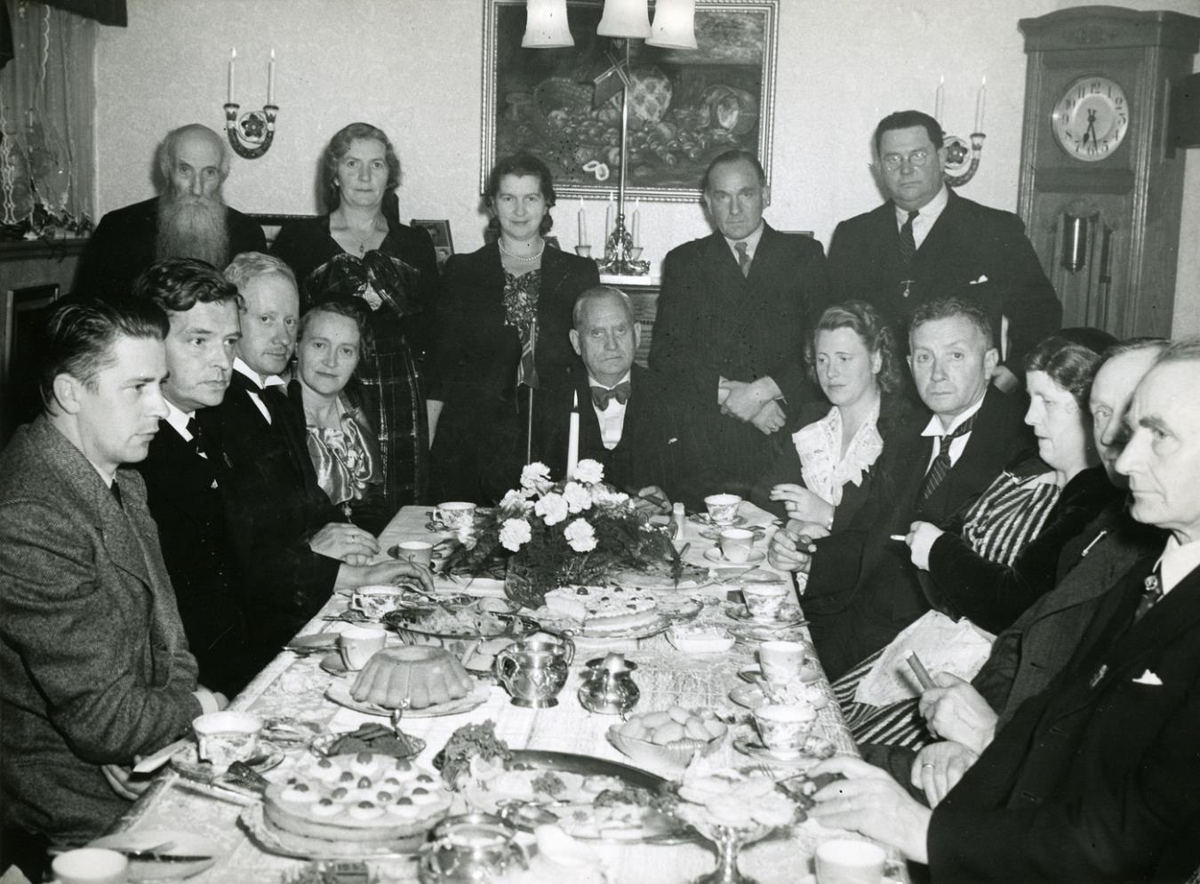 Hópur prúðbúins fólks við dúkað kaffiborð þar sem fram eru bornar margvíslegar tertur og kabbibrauð. Sveinn Björnsson situr fyrir borðsenda.