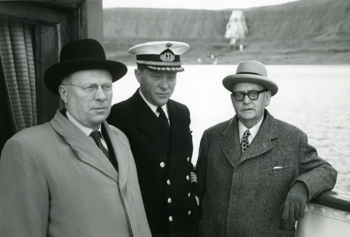 Um borð í varðskipinu Ægi; talið frá vinstri: Jóhann Gunnar Ólafsson sýslumaður, Þórarinn Björnsson skipherra, Sveinn Björnsson forseti. Í bakgrunn sést fossinn Dynjandi í Arnarfirði.
