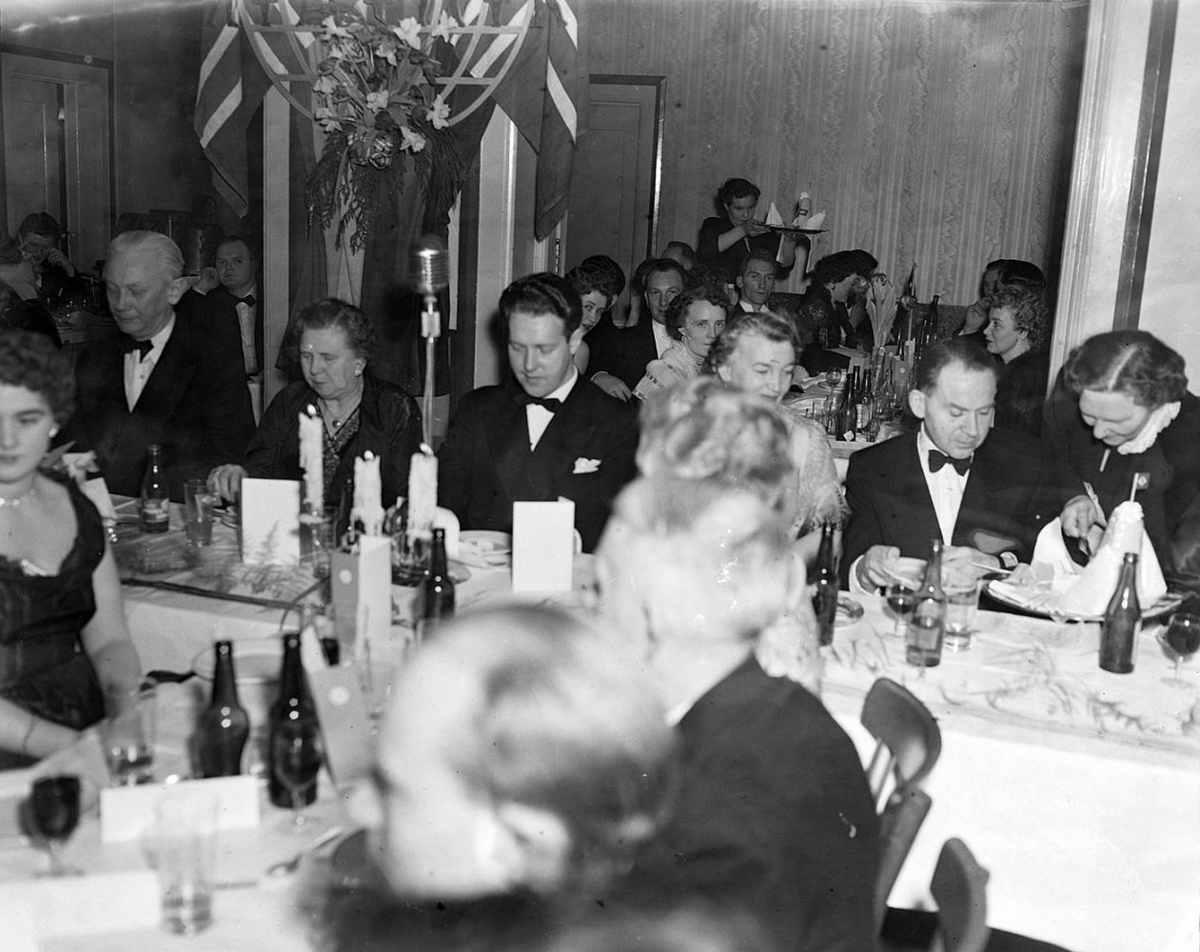 Fólk sitjandi til borðs í veislusal. Skraut með hnetti með myndum fólks sem helst í hendur yfir háborði. Kona að bera gesti mat af fati. Við háborðið má þekkja: Vilhjálmur Þór, Guðlaug Kvaran kona Sigurðar Kristinssonar, Erlendur Einarsson, óþekkt, Eysteinn Jónsson. Veisla tengd SÍS?