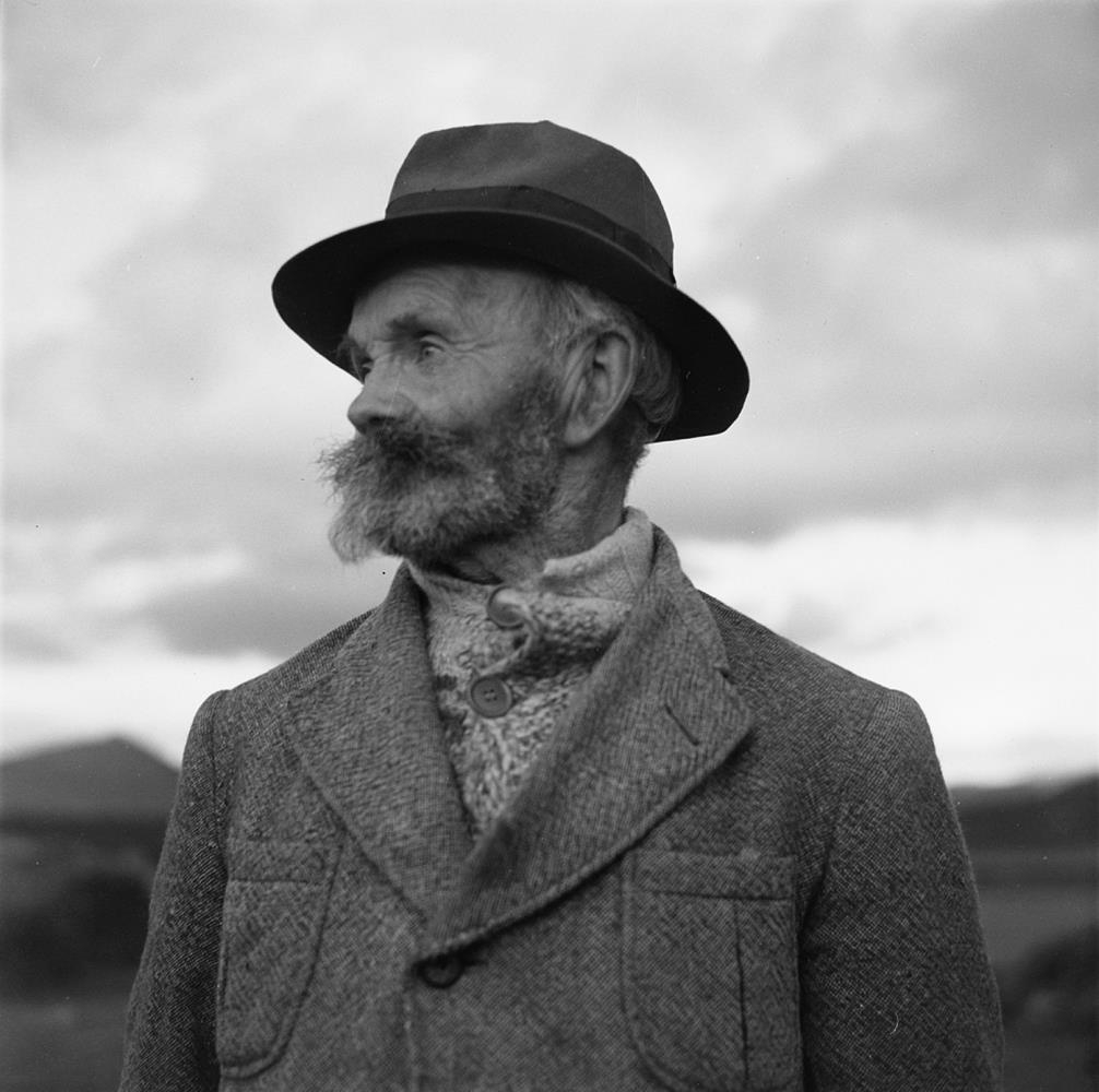 Maður með hatt í ullarjakka og hnepptri ullarpeysu innanundir. Jósep Gottfreð.