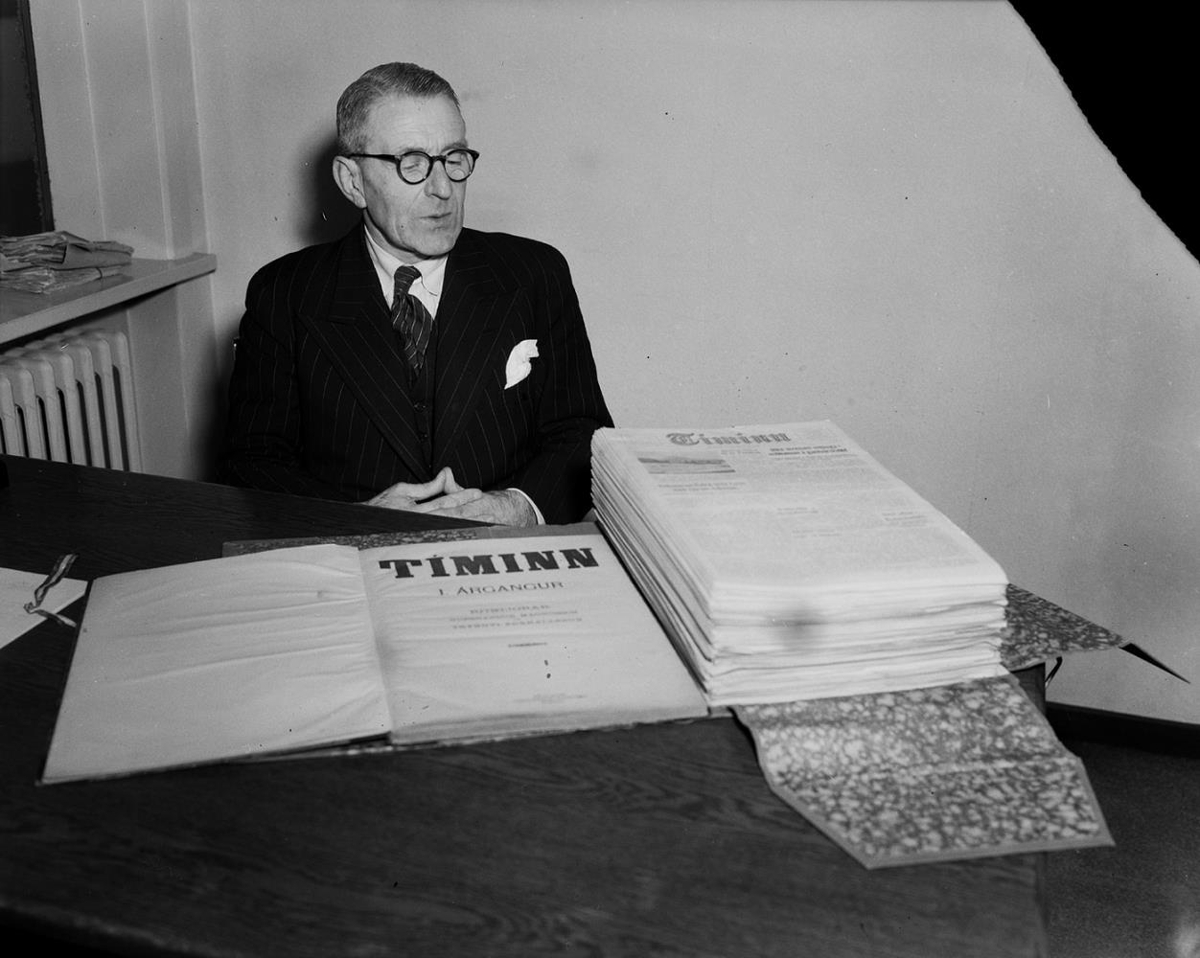 Maður við skrifborð með möppu með blaði sem á stendur TÍMINN fyrir framan sig. Guðbrandur Magnússon forstöðumaður ÁTVR og áður framkvæmdastjóri Tímans.