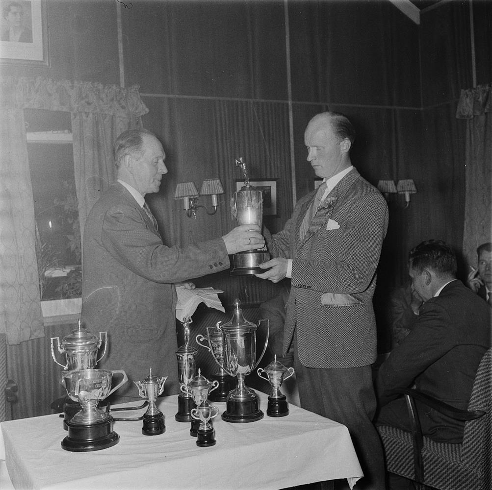Golfskálinn. Öskjuhlíð. Reykjavík.Verðlaunaafhending. Margir bikarar á dúkuðu borði og maður að afhenda öðrum manni bikar.