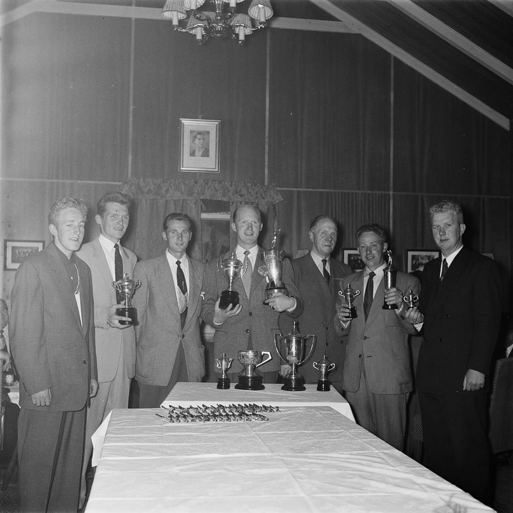 Golfskálinn. Öskjuhlíð. Reykjavík.Sjö menn flestir með bikara standa við borð. c