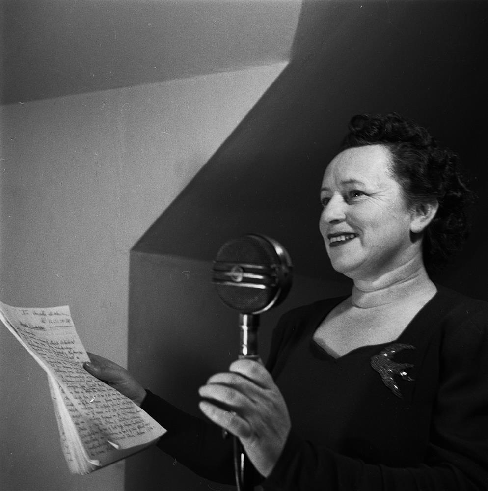 Rannveig Þorsteinsdóttir alþingismaður við hátalara. 1949.