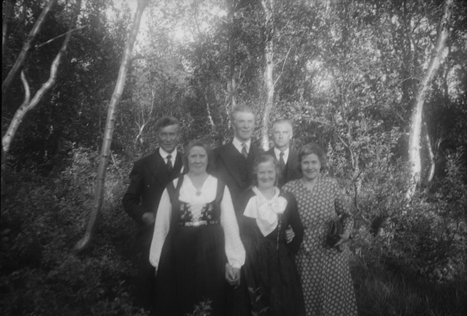 Sex manneskjur standa saman utan dyra við trjálund. Þrjár konur og þrír karlmenn. Líklega systkinin frá Yztafelli: Jón Sigurðsson, Guðbjörg Sigurðardóttir, Marteinn Sigurður Sigurðsson, Hólmfríður Sigurðardóttir, Kristín Sigurðardóttir og Þormóður Sigurðsson.