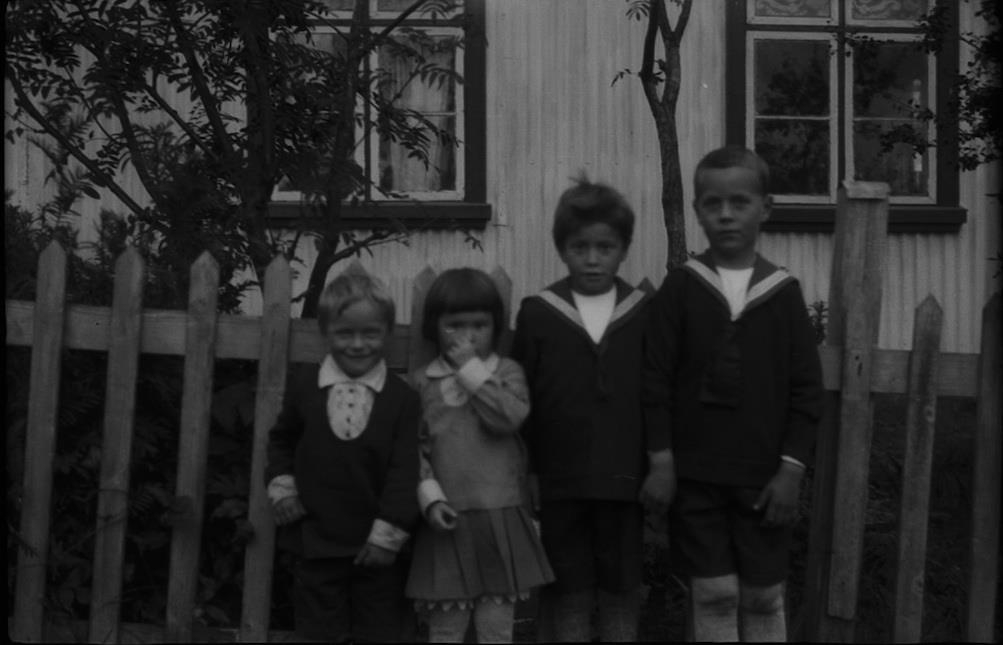 Fjögur börn fyrir framan girðingu við hús, þrír drengir og ein stúlka. Tveir drengjana eru í matrósarfötum.