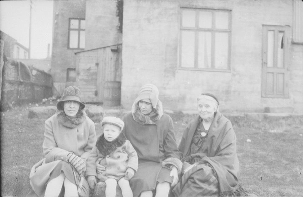 Þrjár konur og eitt barn sitja fyrir framan óþekkt steinsteypt hús.