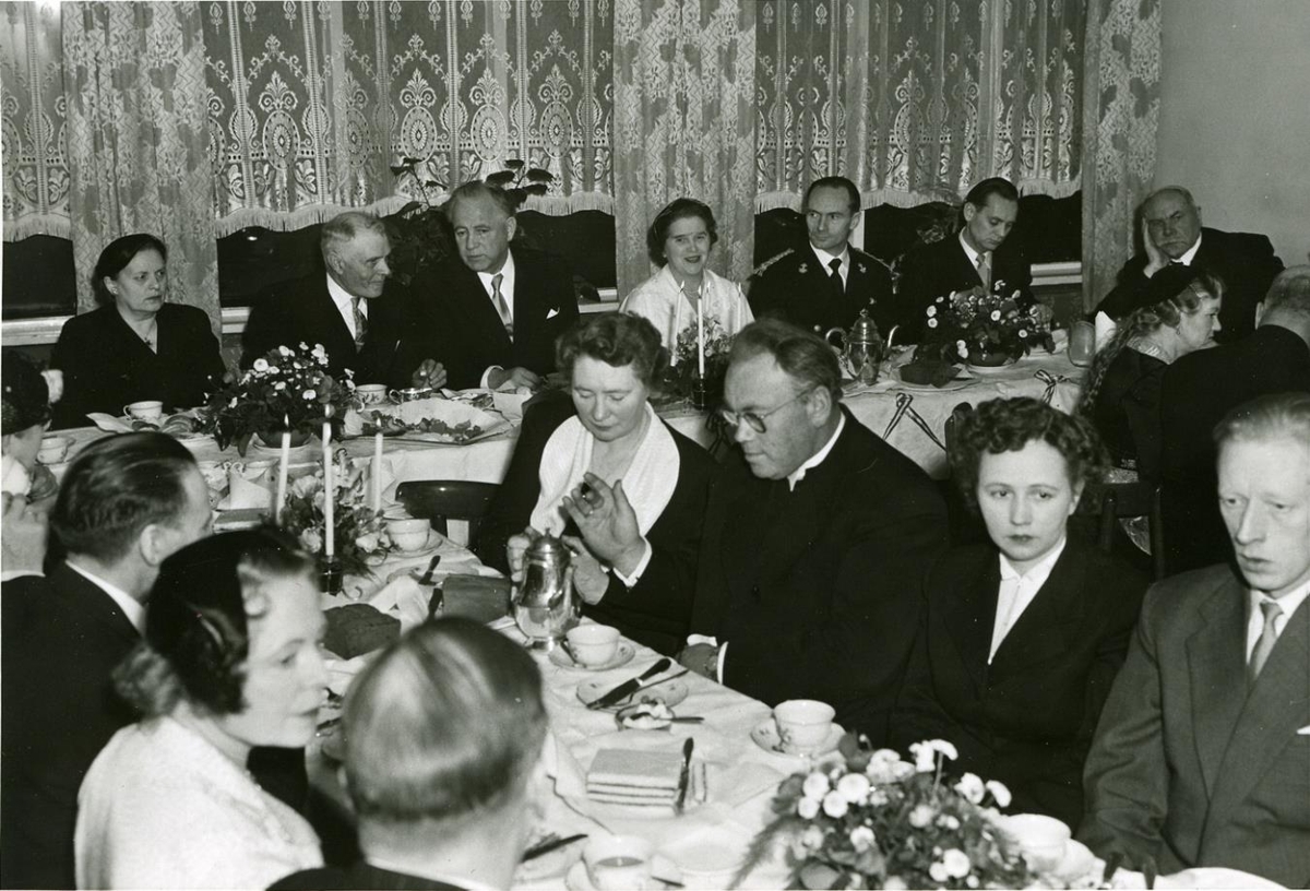 Úr forsetatíð Ásgeirs Ásgeirssonar. Forsetahjónin sitja kaffiboð með móttökunefnd heimamanna, líklega á Selfossi.
