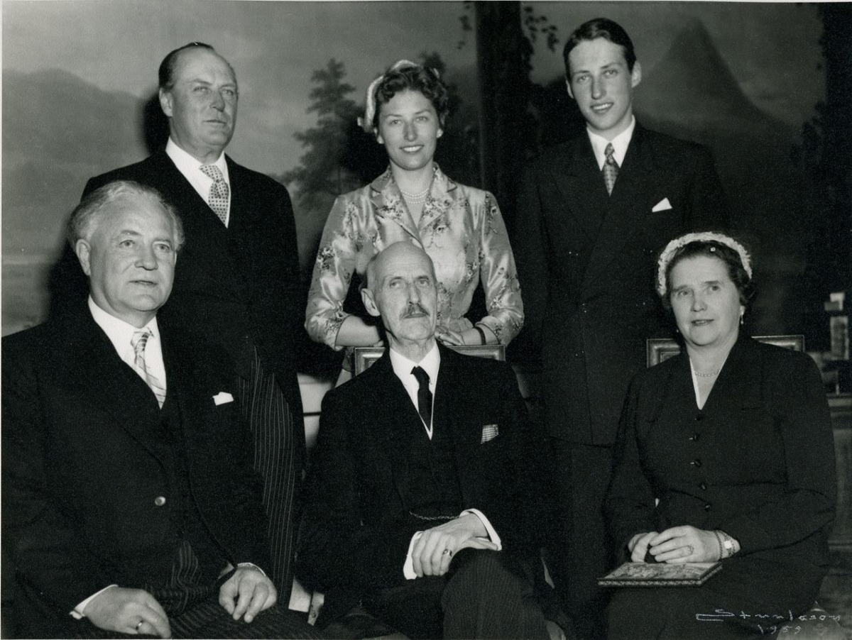 „Neðri röð: Ásgeir Ásgeirsson forseti, Hákon Noregskonungur (d 1957) Dóra Þórhallsdóttir. Efri röð frá vinstri: Ólafur krónprins, dóttir Ólafs, gæti heitið Ragnhildur og loks Haraldur núverandi konungur Noregs.“ (AÍ 2017)