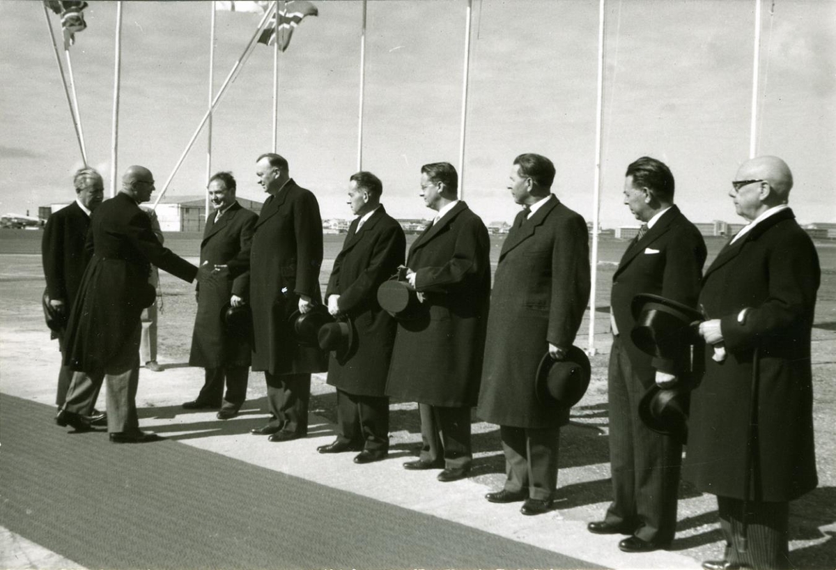 Úr forsetatíð Ásgeirs Ásgeirssonar. Ásgeir Ásgeirsson og (liklega) Uhro Kekkonen Finnlandsforseti heilsa ráðherrum í ríkisstjórninni á Reykjavíkurflugvelli. F.v. Ásgeir Ásgeirsson, Uhro Kaleva Kekkonen, Hermann Jónasson, Guðmundur Í. Guðmundsson, Eysteinn Jónsson, Gylfi Þ. Gíslason, Hannibal Valdimarsson, Emil Jónsson.