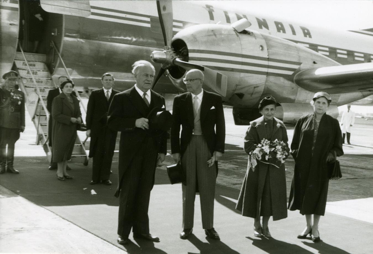 Úr forsetatíð Ásgeirs Ásgeirssonar. Uhro Kekkonen Finnlandsforseti og frú í opinberri heimsókn. Fremst: Ásgeir Ásgeirsson, Uhro Kekkonen, frú Kekkonen og Dóra Þórhallsdóttir.