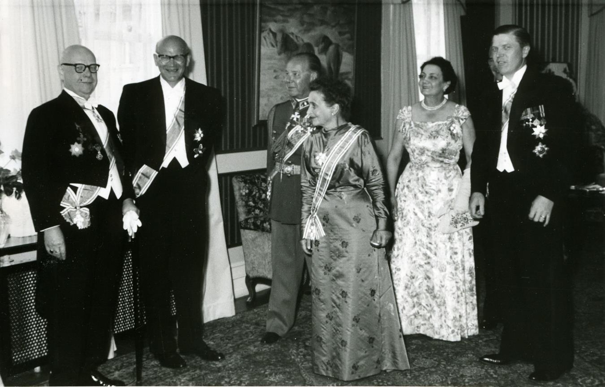 Úr forsetatíð Ásgeirs Ásgeirssonar. Uhro Kekkonen Finnlandsforseti og frú ásamt fleiri tignum gestum í móttöku á Bessastöðum.