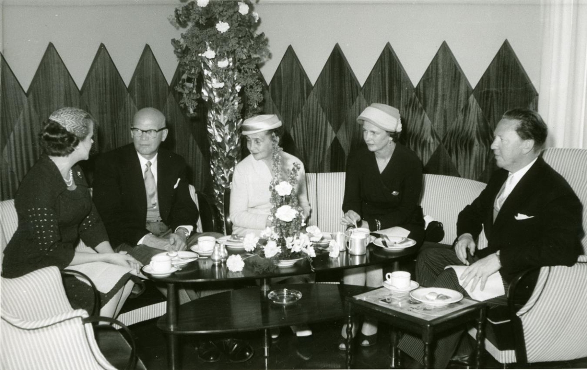 Úr forsetatíð Ásgeirs Ásgeirssonar. Heimsókn Kekkonens Finnlandsforseta. F.v. Dóra Þórhallsdóttir, Uhro Kekkonen, Sylvi Kekkonen, Vala Á. Thoroddsen, Gunnar Thoroddsen borgarstjóri.