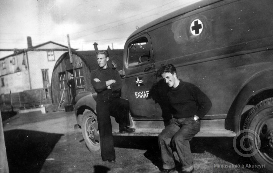 myndin sennilega tekin á Akureyri. Sjúkrabíllinn merktur RNNAF sem gæti staðið fyrir Royal Navy National Air Force