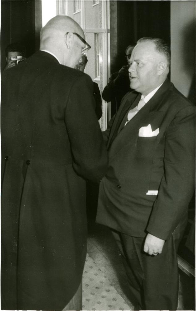 Úr forsetatíð Ásgeirs Ásgeirssonar. Uhro Kekkonen Finnlandsforseti á tali við óþekktan karlmann í Hátíðarsal Háskóla Íslands.