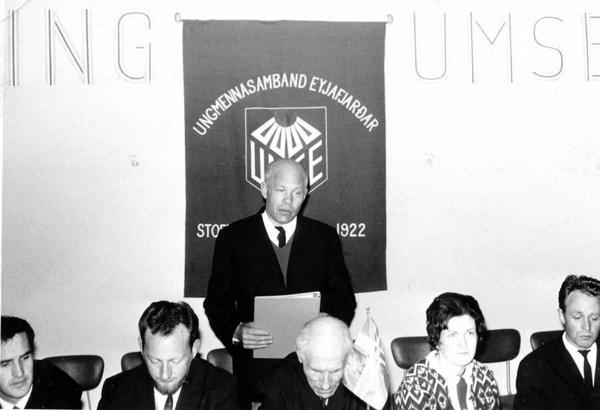 Frá ársþingi UMSE. Talið frá vinstri: Kristján Jónsson, Haukur Halldórsson Umf. Æskan, Helgi Símonarson Umf. Þorsteinn Svörfuður, Ása Marinósdóttir Umf. Reynir, og Sveinn Jónsson Umf. Reynir. Að baki þeirra er Jón Stefánsson Umf. Svarfdæla..