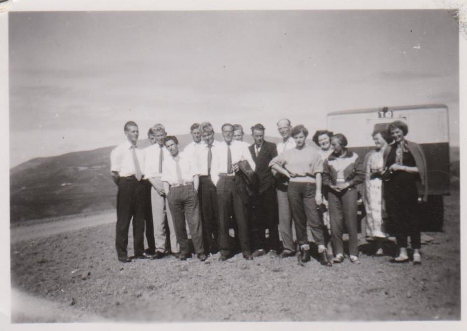 Hópmynd fyrir framan bifreið með bílnúmerið T-10.
