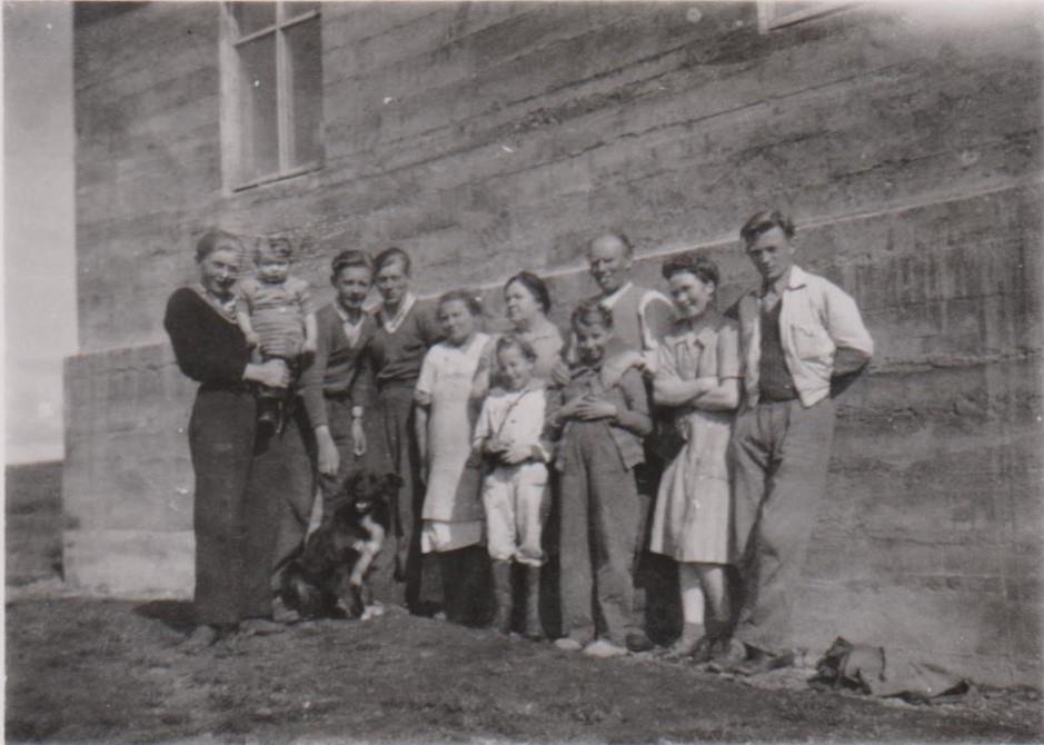 Hópmynd við íbúðarhúsið á Kirkjubóli við Steingrímsfjörð. Myndasafn Rósu Jónídu Benediktsdóttir á Kirkjubóli við Steingrímsfjörð á Ströndum.