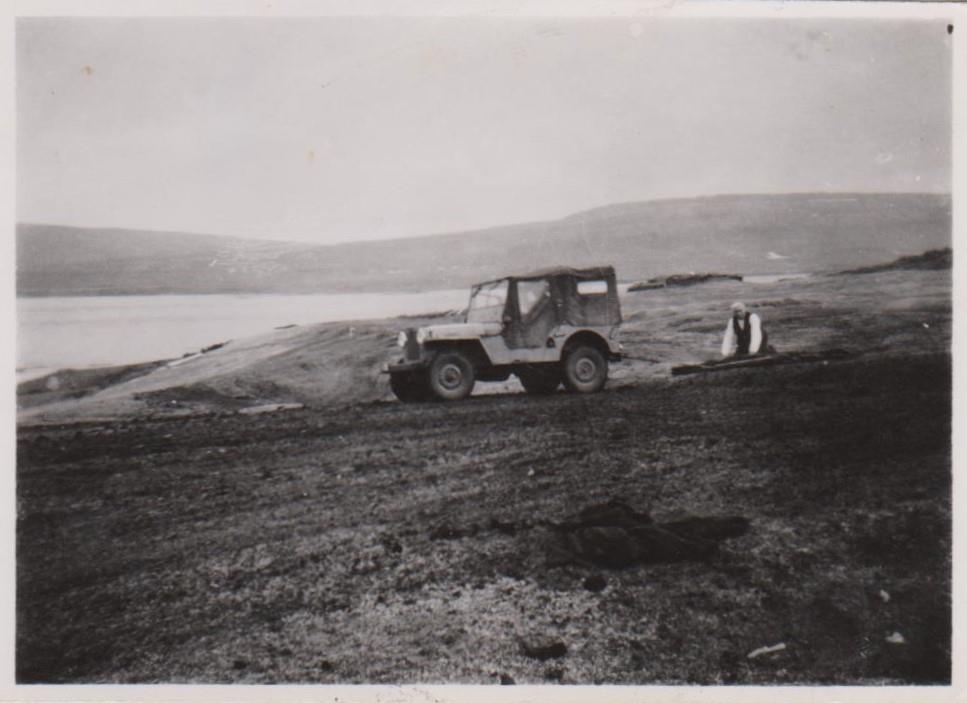 Verið að slóðadraga tún á Kollafjarðarnesi með Willysjeppa sem dregur slóðann á eftir sér. Séra Jón Brandsson situr á slóðanum til að þyngja hann. Myndasafn Rósu Jónídu Benediktsdóttir á Kirkjubóli við Steingrímsfjörð á Ströndum.