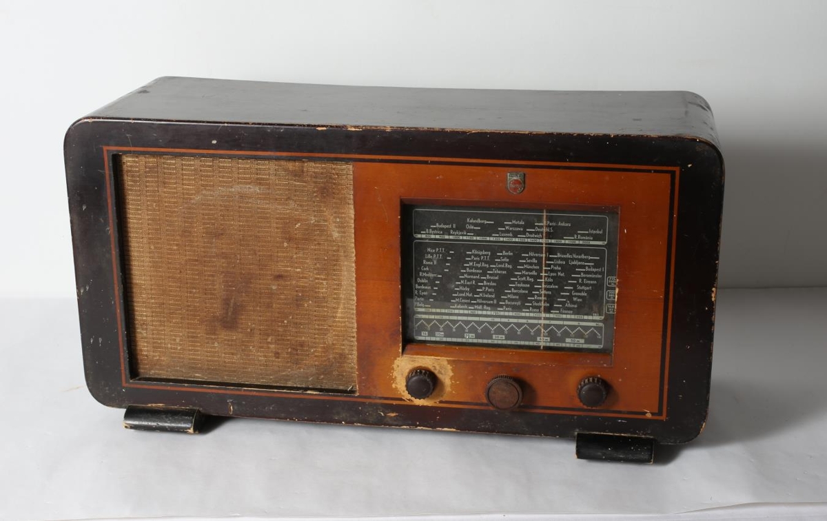 Útvarpstæki af gerðinni Philips. Kassinn er dökkbrúnn en ljósbrúnn viður í kringum hátalara og stjórnborð. Neðan á tækinu er miði sem á stendur "Viðgerðastofa Útvarps 24.08.1958. No. 90009 10575000-03". Tækið var í eigu Einars Bjarnasonar og Kristjönu Einarsdóttur frá Hrjót.